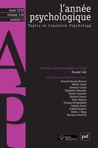 Varia Vol. 118, 2018/1 - pagesPages 3 to 28Spelling while writing textsBy Séverine Maggio, Marie Izaute, Florence ChenuPages 29 to 58The development of recollection and familiarity processes: Behavioral and electrophysiological dataBy Émilie Alibran, Lucie Angel, Badiâa Bouazzaoui, Marie Gomot, Michel IsingriniPages 59 to 92Knowledge and executive control: Two factors that protect against age-related cognitive decline?By Samantha Gombart, Séverine Fay, Michel Isingrini