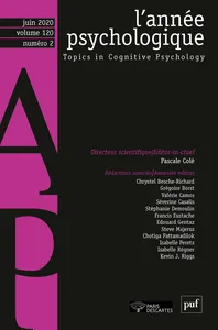 Varia Vol. 120, 2020/2 - pagesPages 99 to 101Introduction to the special issue. The development of working memoryBy Valérie CamosPages 103 to 134The evolution of working memoryBy corresponding author Frederick L. Coolidge, Thomas WynnPages 135 to 156Why and how to study working memory developmentBy Nelson CowanPages 157 to 174The rate of forgetting over time in working memory during early childhoodBy Raphaëlle Bertrand, Izabela Stan-Zahno, corresponding author Valérie CamosPages 175 to 202Children’s working memory develops at similar rates for sequences differing in compressibilityBy corresponding author Fabien Mathy, Ori Friedman, Nicolas Gauvrit, Alessandro Guida, Michaël FartoukhPages 203 to 229Core mechanisms underlying the long-term stability of working memory traces still work in agingBy Gabriel Jarjat, Gaën Plancher, corresponding author Sophie Portrat