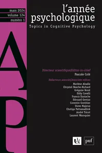 Varia Vol. 124, 2024/1 - pagesPages 3 to 15Adaptation of time to transcribe based on typing performance to reduce inter-individual varianceBy Aurélie Huret, Florian Vié, Julie Brellier, André TricotPages 17 to 46French validation of the Multidimensional fatalism measure by Esparza et al. (2015)By Robert Ngueutsa, Mohamed Boua, Charlay Indoumou Peppe, Gustave Adolphe Messanga, Charles Le Grand Tchagneno, Violaine Kubiszewski, Florent LheureuxPages 47 to 77Reducing inequalities in word-problem solving. Working on comprehension before processing numbers.By Ingrid Claracq, Michel Fayol, Bruno VilettePages 79 to 100Parkinson’s disease and the need for technological tools to support communication: qualitative studyBy Élise Batselé, Hélène Geurts, Elise Buchet, Marie-Claire Haelewyck, Mathilde BoutiflatPages 101 to 136Reflection on the stakes of the adoption of social robots: advantages, threats, barriers and driftsBy Dayle David, Isabelle MilhabetPages 137 to 160Surface similarity-based retrieval: in default or by default?By Lucas Raynal, Emmanuel Sander, Évelyne Clément
