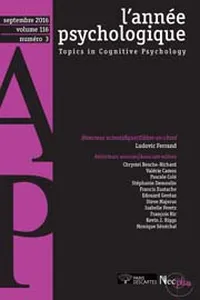 Varia Vol. 116, 2016/3 - pagesPages 351 to 389The contribution of executive and non-executive capacities to various-short-term recall situations: A study on the elderlyBy Pascale Larigauderie, Marie Lange, Aline Dutheil, Charlotte Cérémonie, Siobhan Vicente, Manuel GimenesPages 391 to 418The relationship between attachment and self-esteem in adolescents placed in foster or institutional care: The respective contribution of the biological mother and secondary caregiverBy Anne-Sophie Deborde, Camille Danner Touati, Laura Herrero, Abdelmounaim TouatiPages 419 to 465Embodied cognition: A perspective on spatial representationsBy Léo Dutriaux, Valérie GyselinckPages 467 to 488The use of the operand recognition paradigm for the study of arithmetic strategies: An overviewBy Catherine Thevenot, Sandrine Masson, Michel Fayol