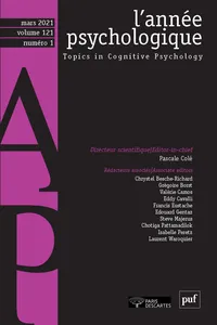 Varia Vol. 121, 2021/1 - pagesPages 3 à 24French Validation of the Youth Sport Values Questionnaire-2 (FVYSVQ-2): Reliability and Validity Study in Young CompetitorsPar Youssef Albouza, Monique Wach, Pierre ChazaudPages 25 à 70Effet d’une induction émotionnelle par la musique sur la détection d’erreurs orthographiques : étude chez l’enfant et chez l’adultePar Lucille Soulier, Aurélie Simoës-Perlant, Pierre LargyPages 71 à 99Les modifications du fonctionnement cognitif et émotionnel avec l’avancée en âge au prisme d’une approche incarnéePar Sandrine Vieillard, Clément MsikaPages 101 à 139Traitements sémantiques et émotionnels des scènes visuelles complexes : une synthèse critique de l’état actuel des connaissancesPar Anaïs Leroy, Sara Spotorno, Sylvane Faure