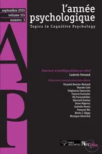 Varia Vol. 115, 2015/3 - pagesPages 327 à 350Minimizing a sexist act and derogating the female victim: To be or not to be in the same boat?Par Anne-Laure Hernandez, Sandrine Redersdorff, Delphine MartinotPages 351 à 383Le développement des stratégies de régulation affective au cours de l’âge adultePar Sarah Le Vigouroux, Bruno Dauvier, Anne Congard, Jean-Luc Kop, Jean-Baptiste Pavani, Pierre-Yves GillesPages 385 à 408Biais de mémorisation dans le trouble bipolaire à l’euthymie : l’effet perturbateur de la joiePar Lauriane Lescalier, Raoul Belzeaux, Jean-Michel Azorin, Christine Deruelle, Pascale Mazzola-PomiettoPages 409 à 434Développement d’un questionnaire de connaissances sémantiques des objets naturels et manufacturés pour enfants de 5 à 9 ansPar Isabelle Simoes-Loureiro, Laurent LefebvrePages 435 à 462Comment les intervalles temporels entre les répétitions d’une information en influencent-ils la mémorisation ? Revue théorique des effets de pratique distribuéePar Émilie Gerbier, Olivier KoenigPages 463 à 493Joindre le geste à la parole : les liens entre la parole et les gestes co-verbauxPar Angela Di Pastena, Loris Tamara Schiaratura, Françoise Askevis-Leherpeux